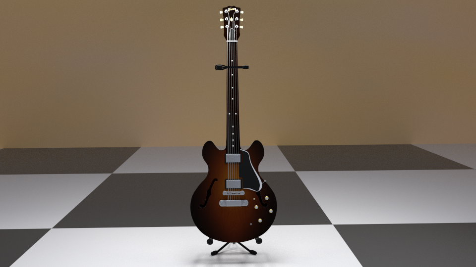 Depois de todos as partes modeladas o último dia foi basicamente para “dar vida” ao modelo acrescentando cores e texturas. Eu também adicionei um ambiente para poder criar uma cena com objeto, modelei um suporte tripé de guitarra e uma sala para não deixar os objetos flutuando.