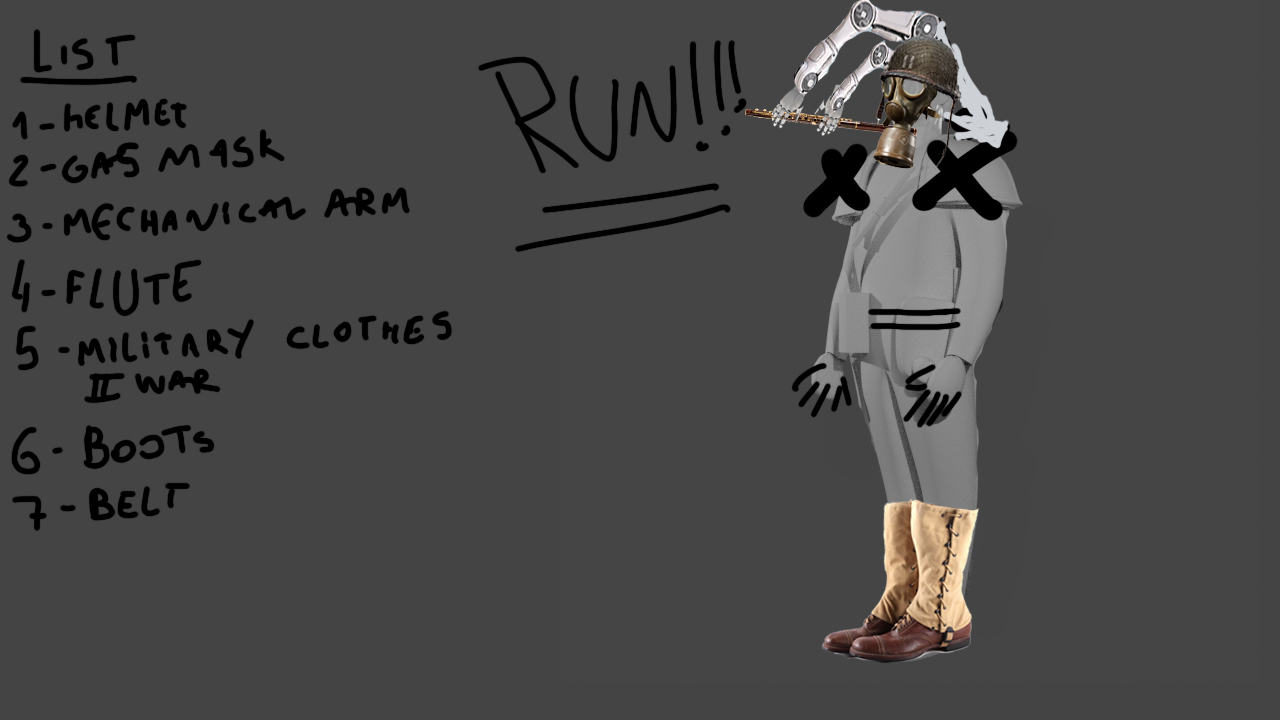 Falando um pouco mais sobre o Challenge do FlippedNormals o tema foi sobre personagens de contos de fadas em um momento diferente de que se passa sua história ou em um passado muito distante ou muito no futuro. Eu escolhi O Flautista de Hamelin, imaginei ele no universo Dieselpunk. Pensei ele usando trajes militares e saindo correndo com sua máscara de gás que é adaptada pra acoplar sua flauta que é tocado com seus braços mecânicos. Possui uma habilidade de encantar as pessoas ou animais com sua música. É um personagem corajoso, mas quando firma um acordo gosta que seja cumprido. O Flautista costuma dizer “Se você não cumprir seu acordo a última coisa que ouvirá será minha música, te garanto será a melhor música já ouviu”.