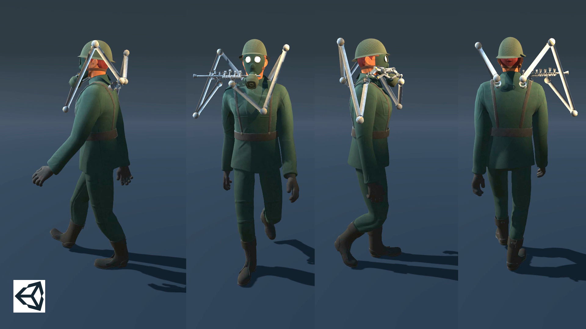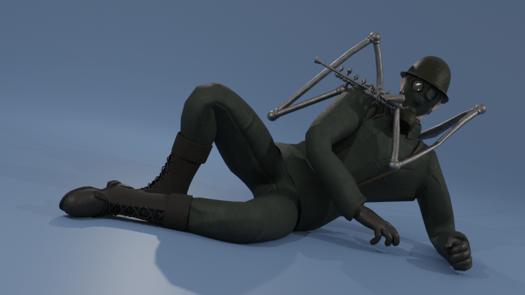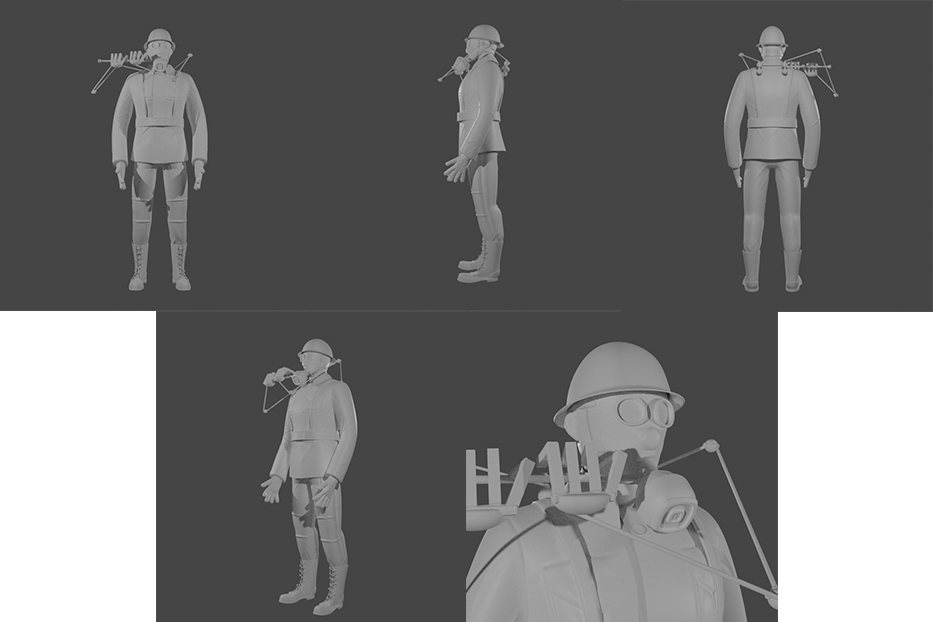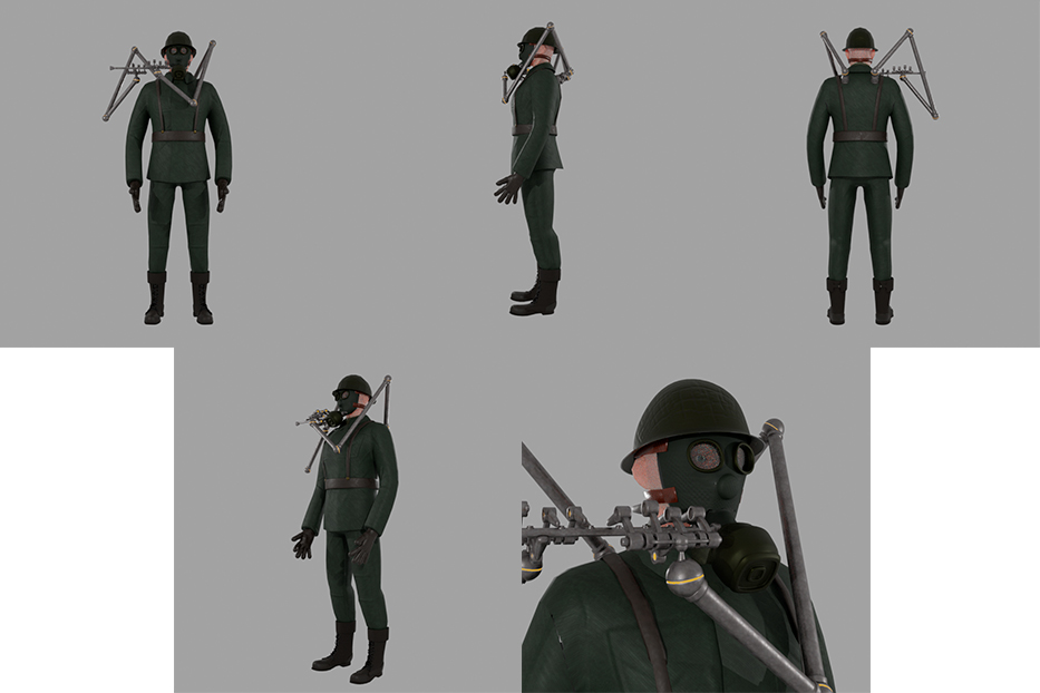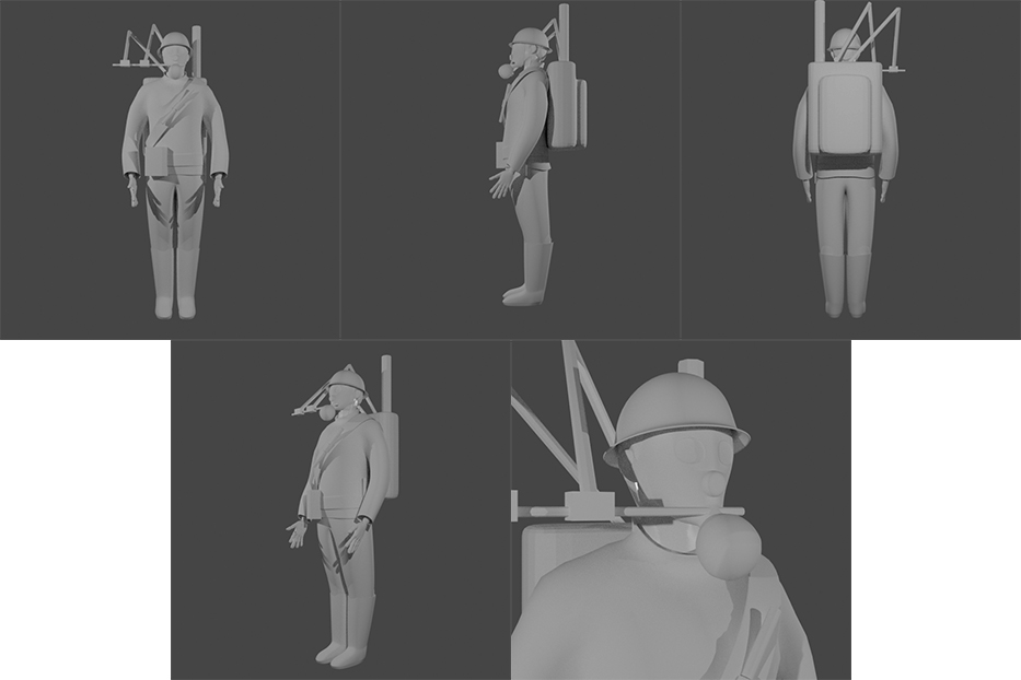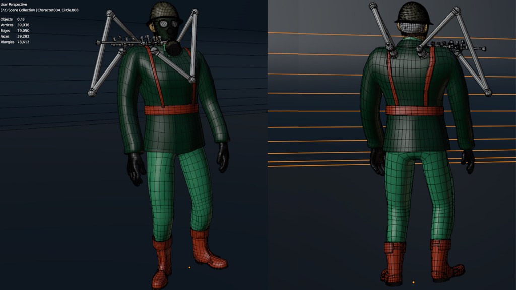Esse foi um pouco do meu processo, tive algumas dificuldade na execução do projeto, principalmente na criação do design das roupas e fazer o detalhamento deles. Na modelagem tive um pouco de dificuldade de achar a melhor densidade de malha, por exemplo a mascara e capacete ficaram mais pesado, como eu acabei perdendo os arquivos que tinham a malha mais leve essa parte acabou ficando com a malha mais densa, essa questão da densidade tem haver de saber qual o limite mínimo de malha que depois de aplicar a textura não fique claro que é um low poly, se você trabalhar com uma quantidade muito baixa, mesmo com o mapa de normal é possível perceber, com as arestas, que se trata de uma malha low poly. Também tive dificuldade na parte de organizar as UV para ter uma melhor distribuição para a aplicação das texturas. Apesar dos problemas foi muito bom para aprender algo novo! Agora consigo ver melhor o processo e onde preciso melhorar para projetos futuro.