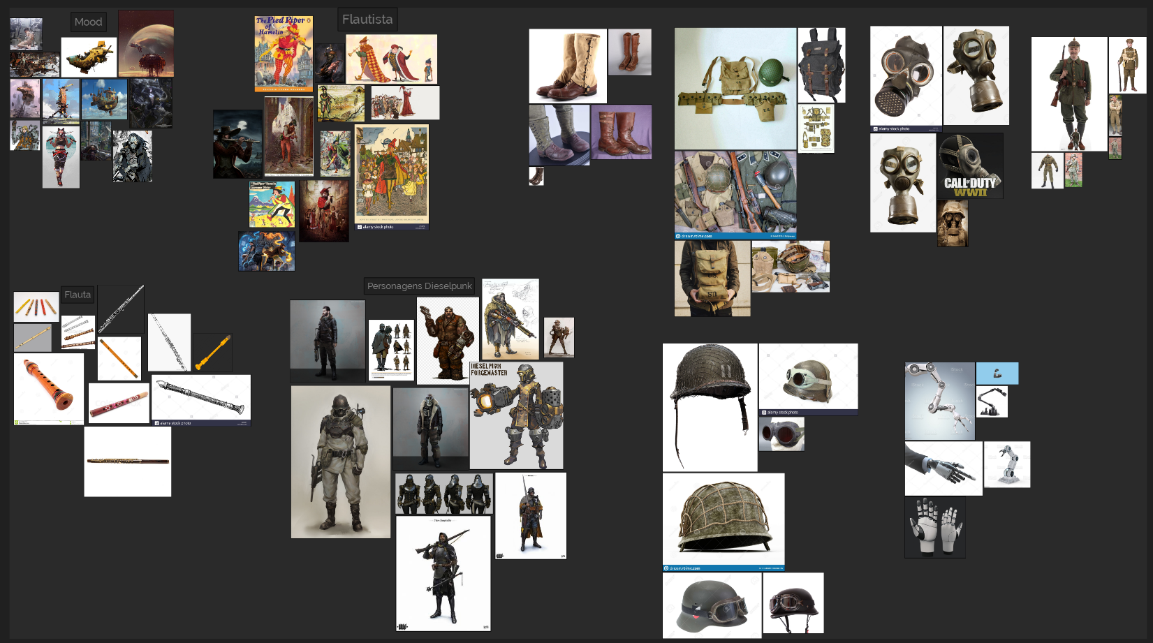 Depois de definir um pouco do personagem e sua história eu fui procurar algumas referência e coloquei no PureRef pra me ajudar a direcionar visualmente na construção do design do flautista.