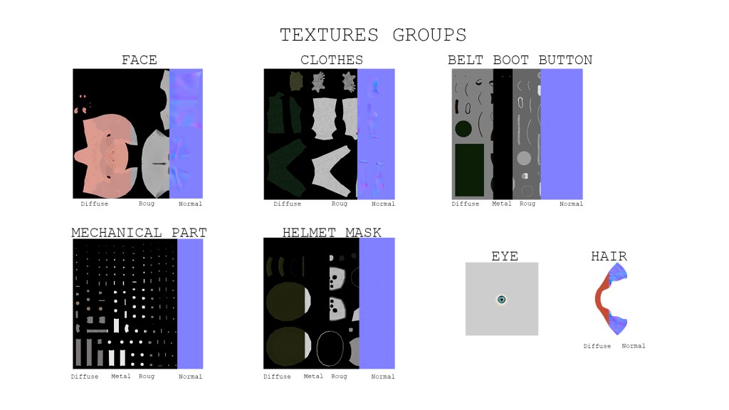 A parte da texturização tive um pouco dificuldade de organizar os packs de UV, abaixo eu mostro os mapas de textura que montei para o personagem.